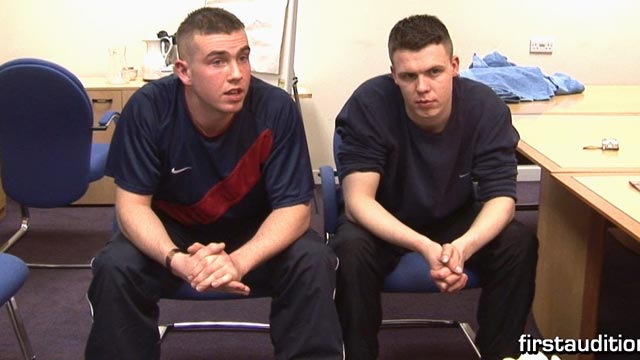 This was my first attempt at auditioning two men at once. Ex-army men Mike and Elliot are cousins so I reasoned with them that since they are notorious for doing threesomes together we might as well save time and do them both at once. They are a real pair of young, spotty, stupid bastards who flirt with each other constantly while firmly asserting they are heterosexuals